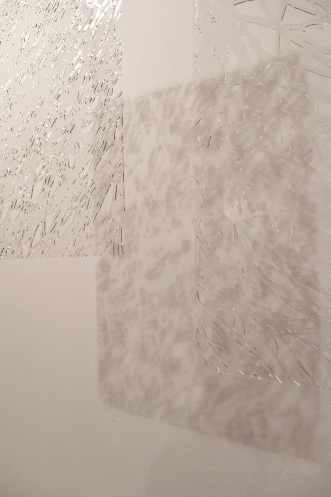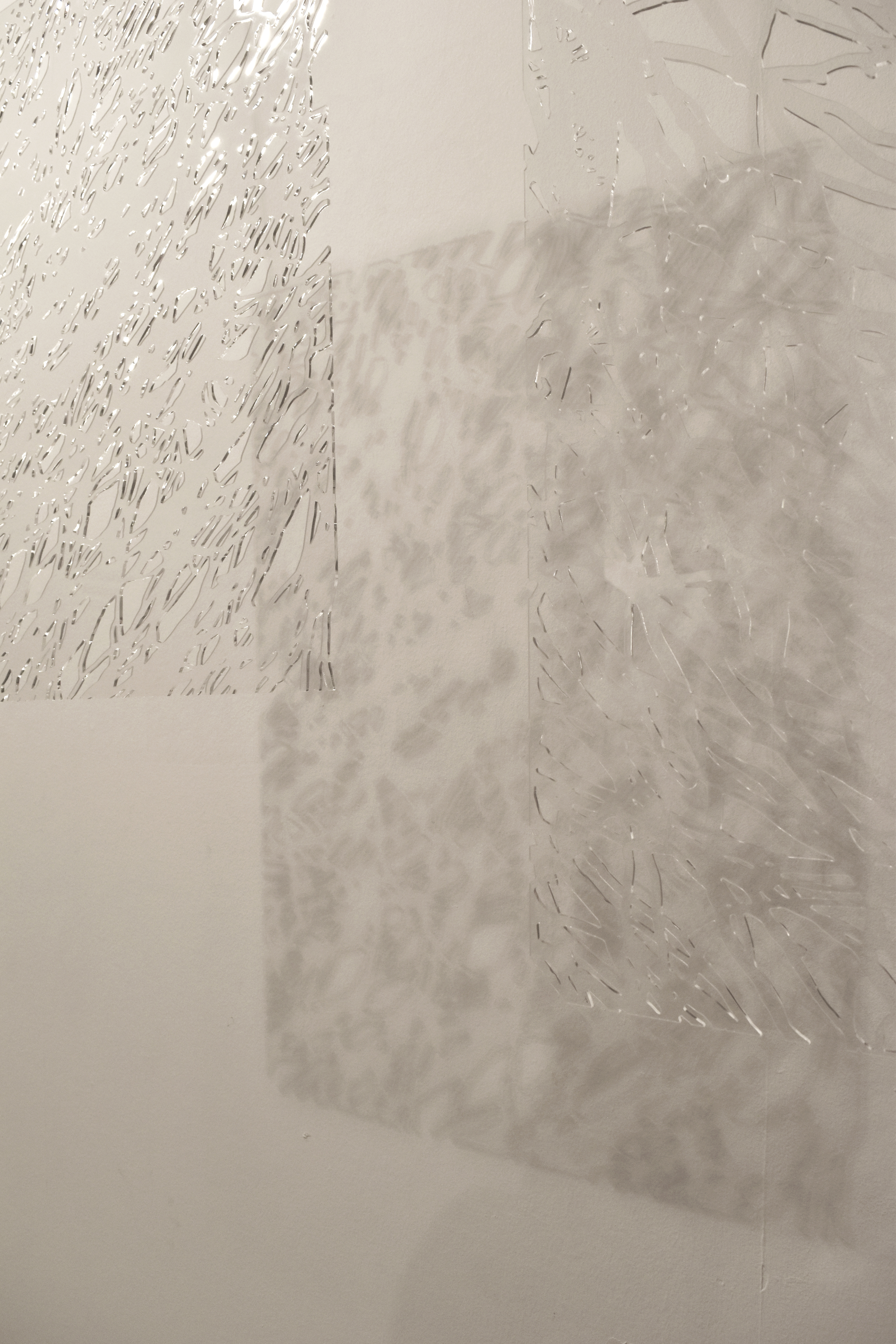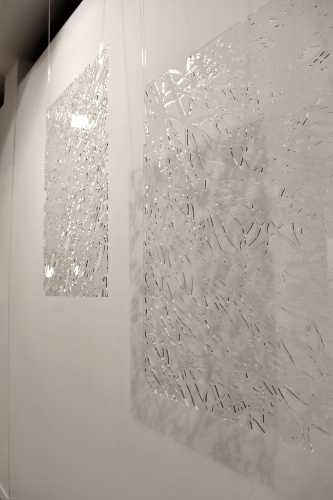 Cartografías invisibles es un conjunto de tres piezas de metacrilato de 70×50 cm. que se han sido trabajadas con corte láser. Esta pieza habla de lo efímero, de las sombras, del recuerdo y la memoria; no nos interesa el elemento en sí, sino las sombras que se proyectan.