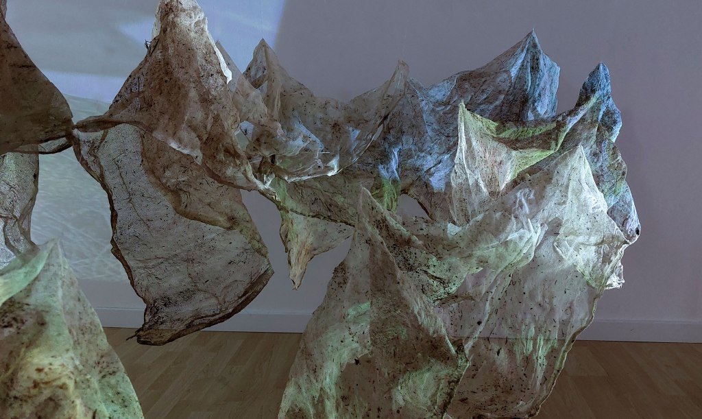 Instalación realizada con tejido de tarlatana intervenido con agua, tierra y elementos naturales; vídeo de la acción proyectado en superposición de la pieza. Dimensiones variables. Pieza expuesta en Primer Encuentro de Arte y Naturaleza en la Huerta de En Corts, Valencia, en 2023
