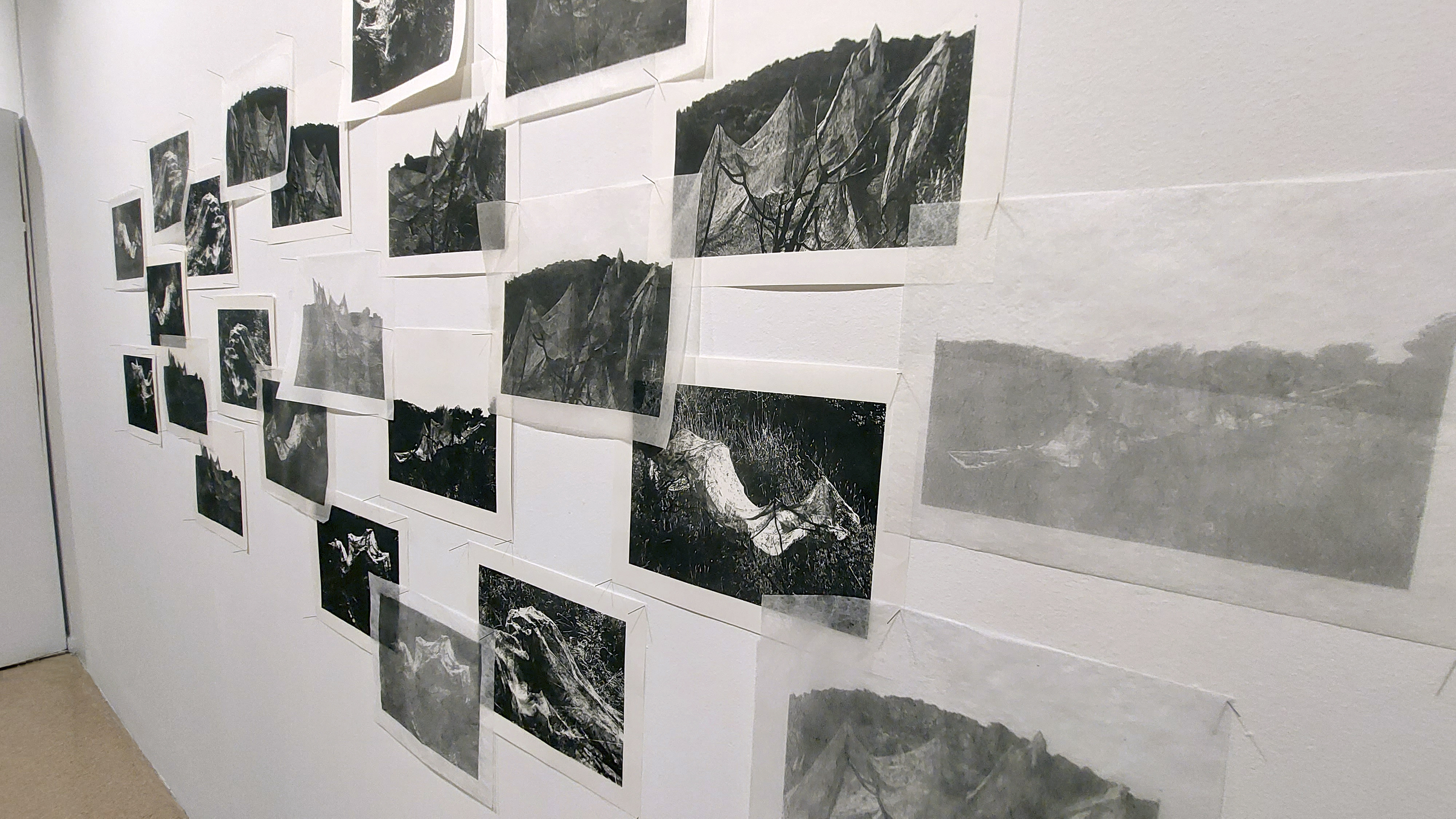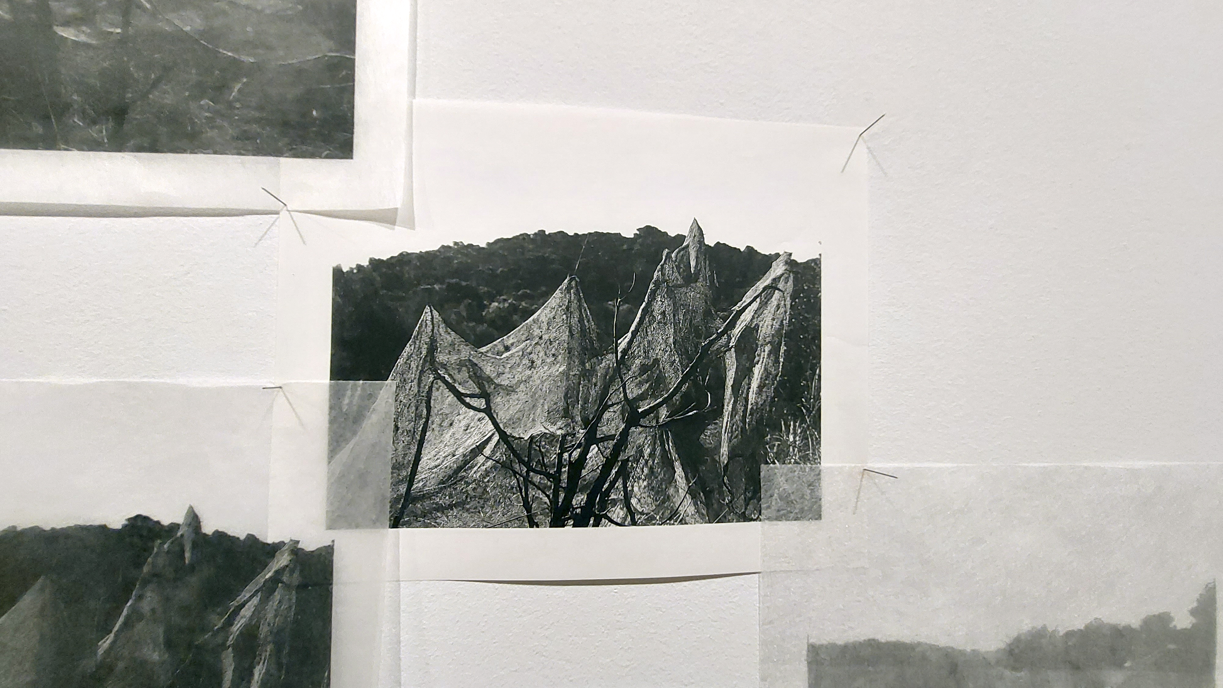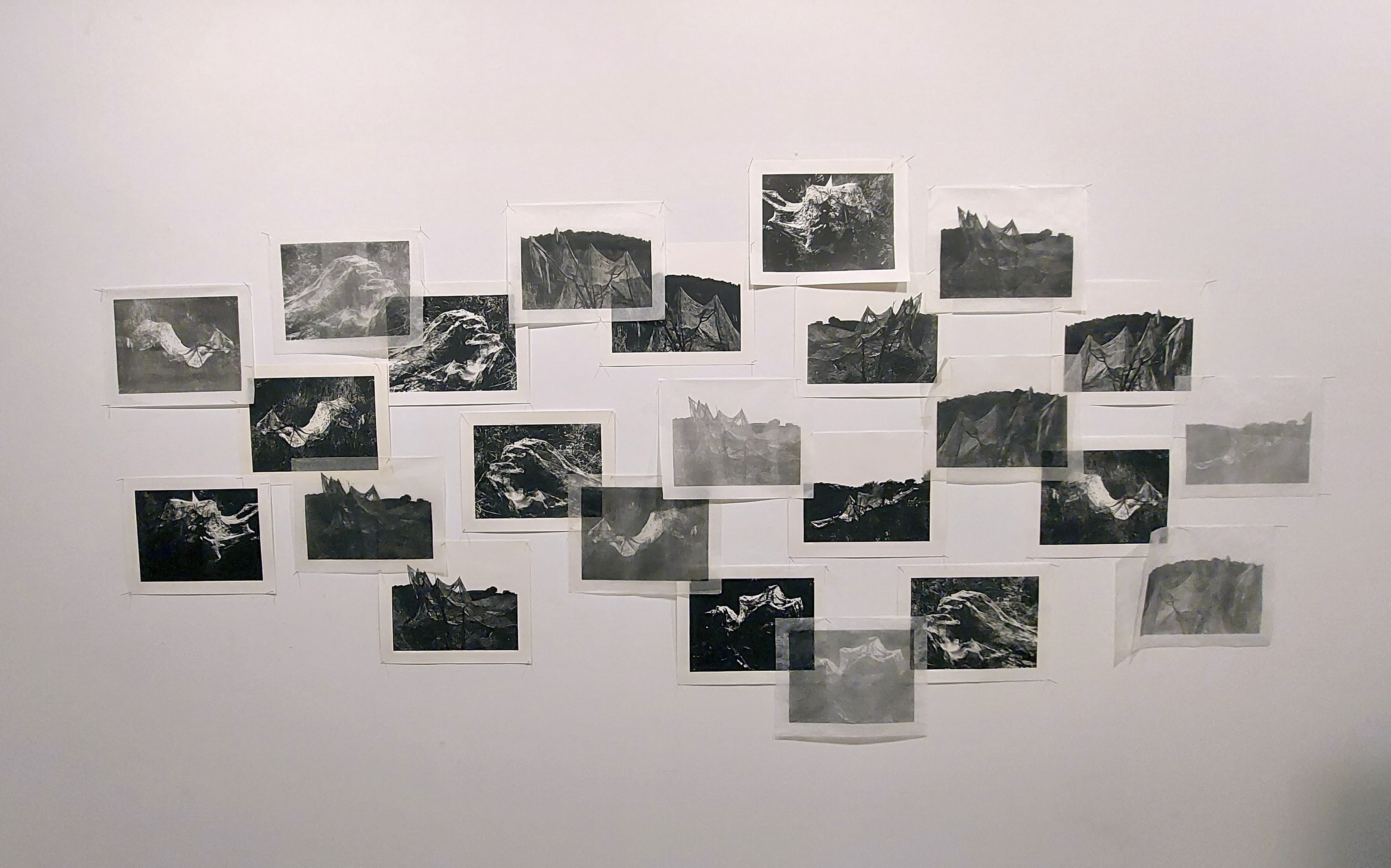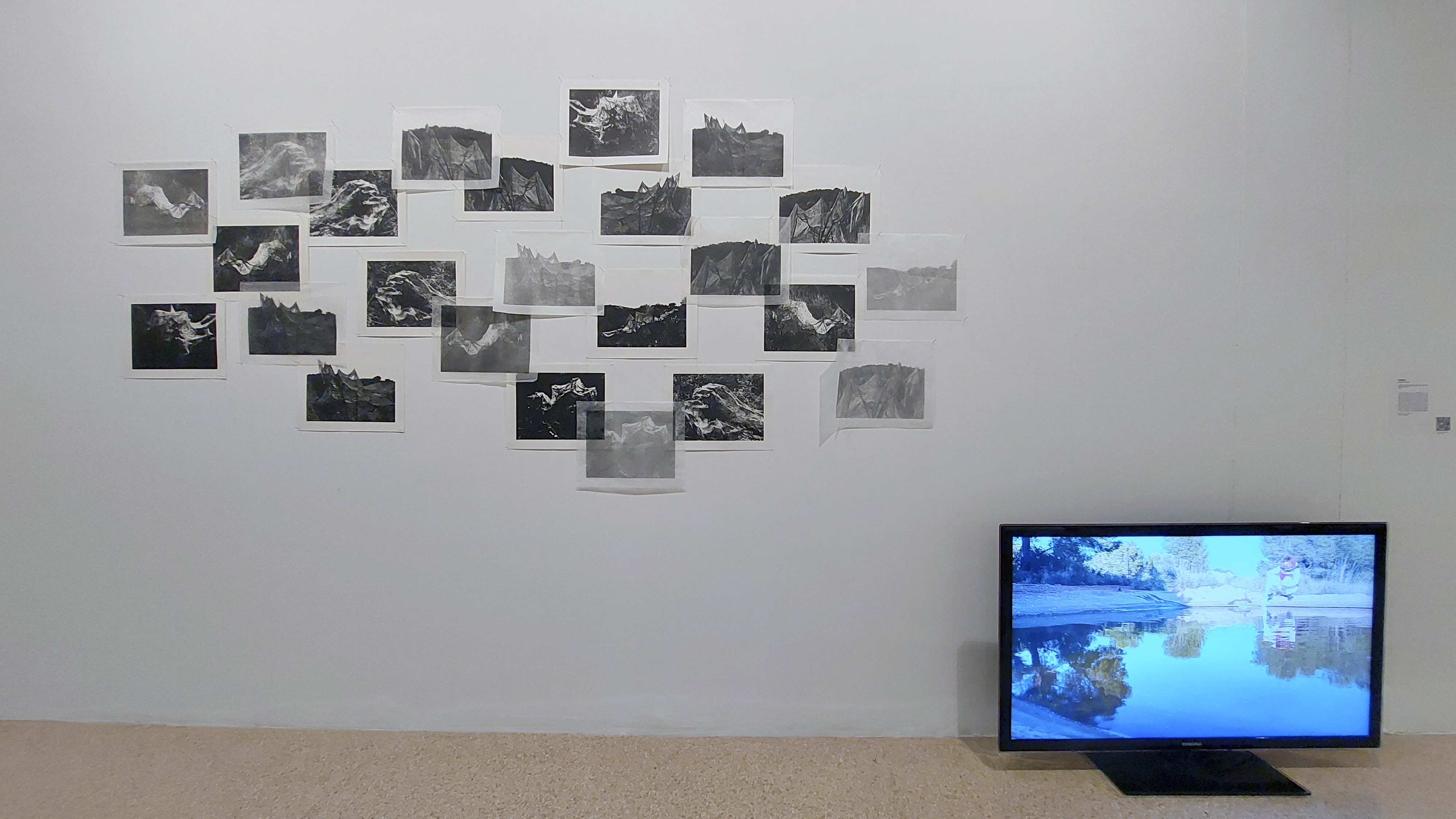 Instalación realizada con superposición de estampas de litografía en diferentes gramajes de papel, como resultado de la documentación de la acción de contemplación y registro sobre el territorio Contemplare. Vídeo de registro del proceso proyectado sobre pantalla de TV en bucle. Pieza expuesta en exposición colectiva Con estas manos, en Casa de Cultura José Peris Aragó en Alboraya, Valencia, en 2023
