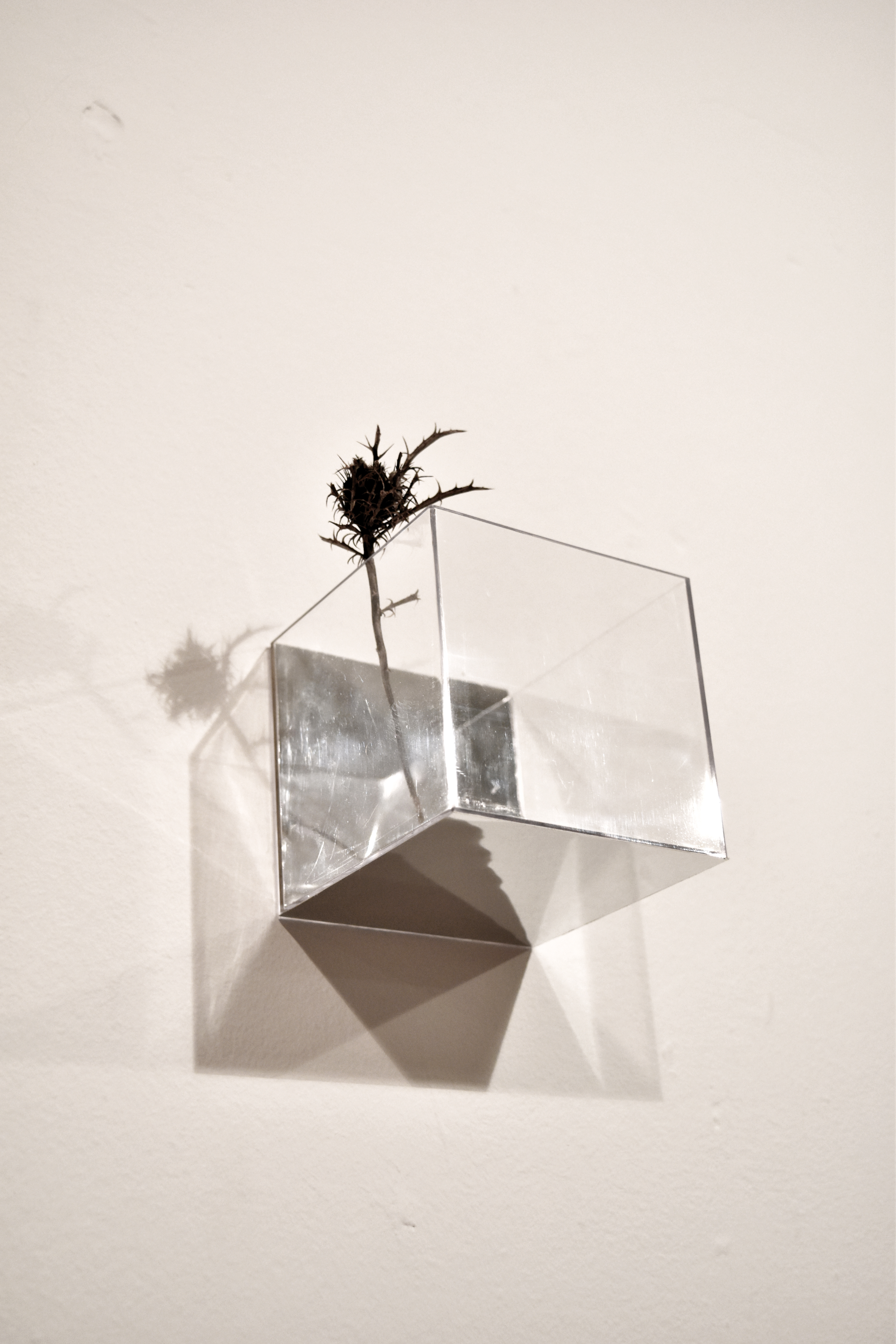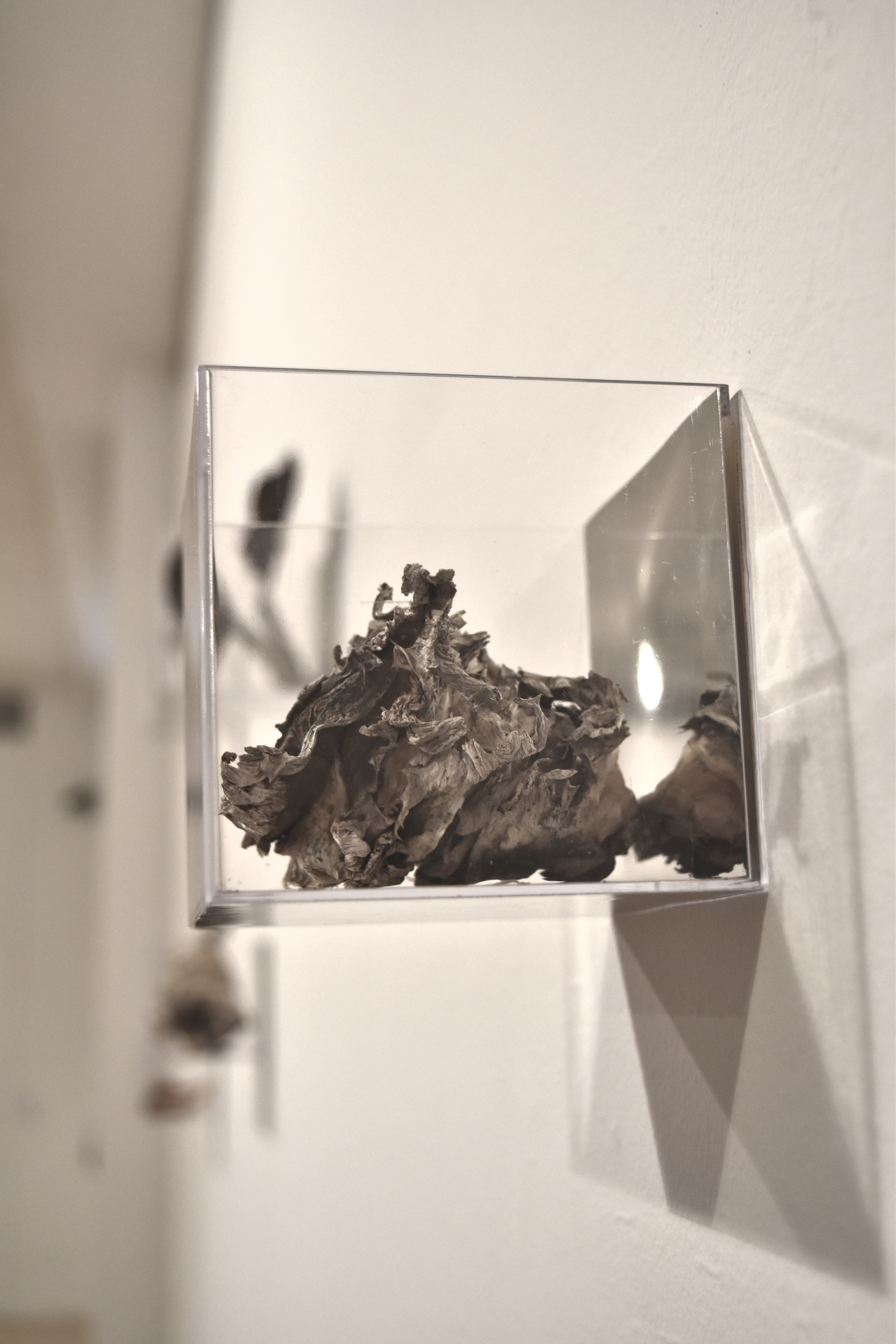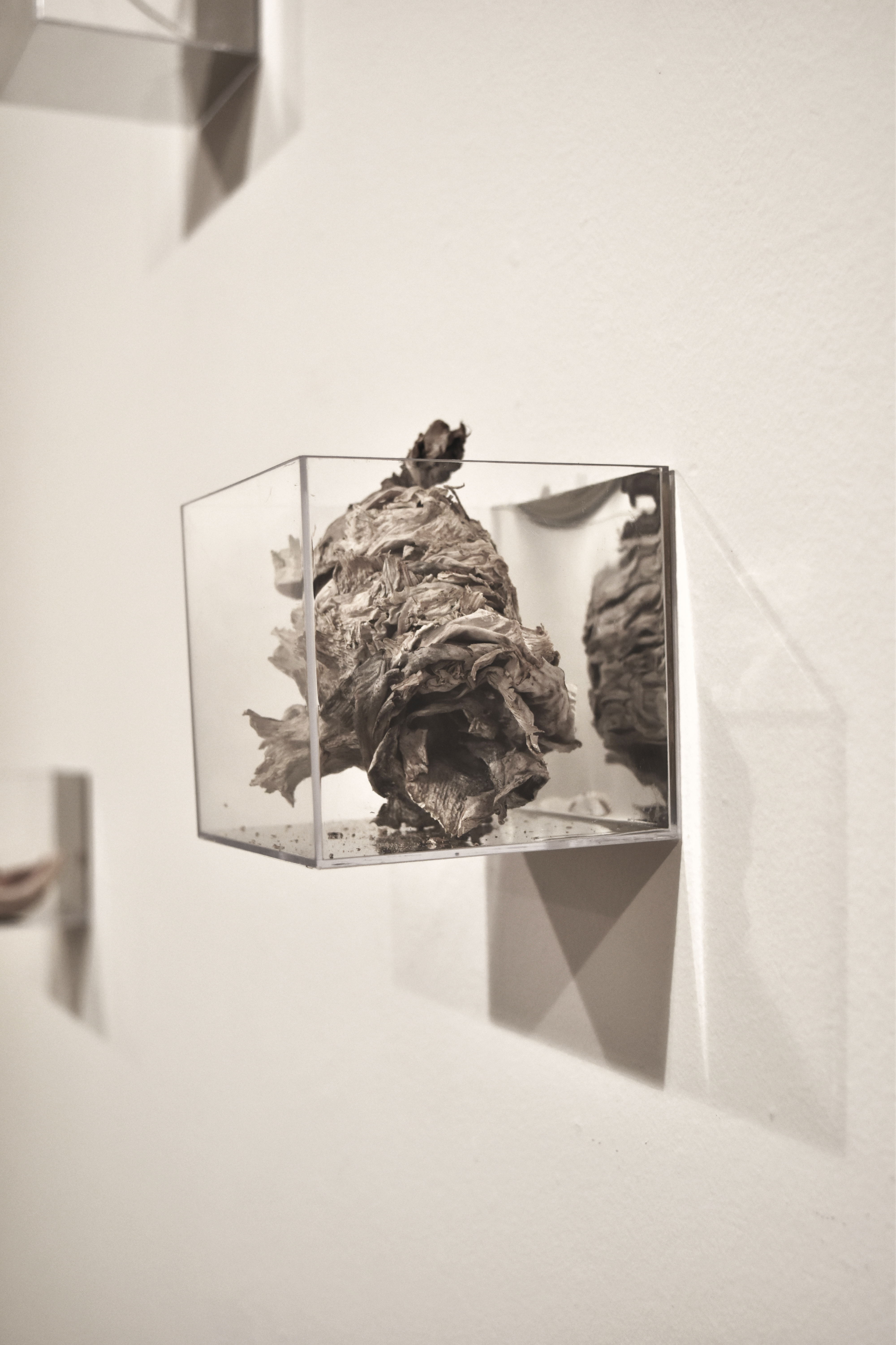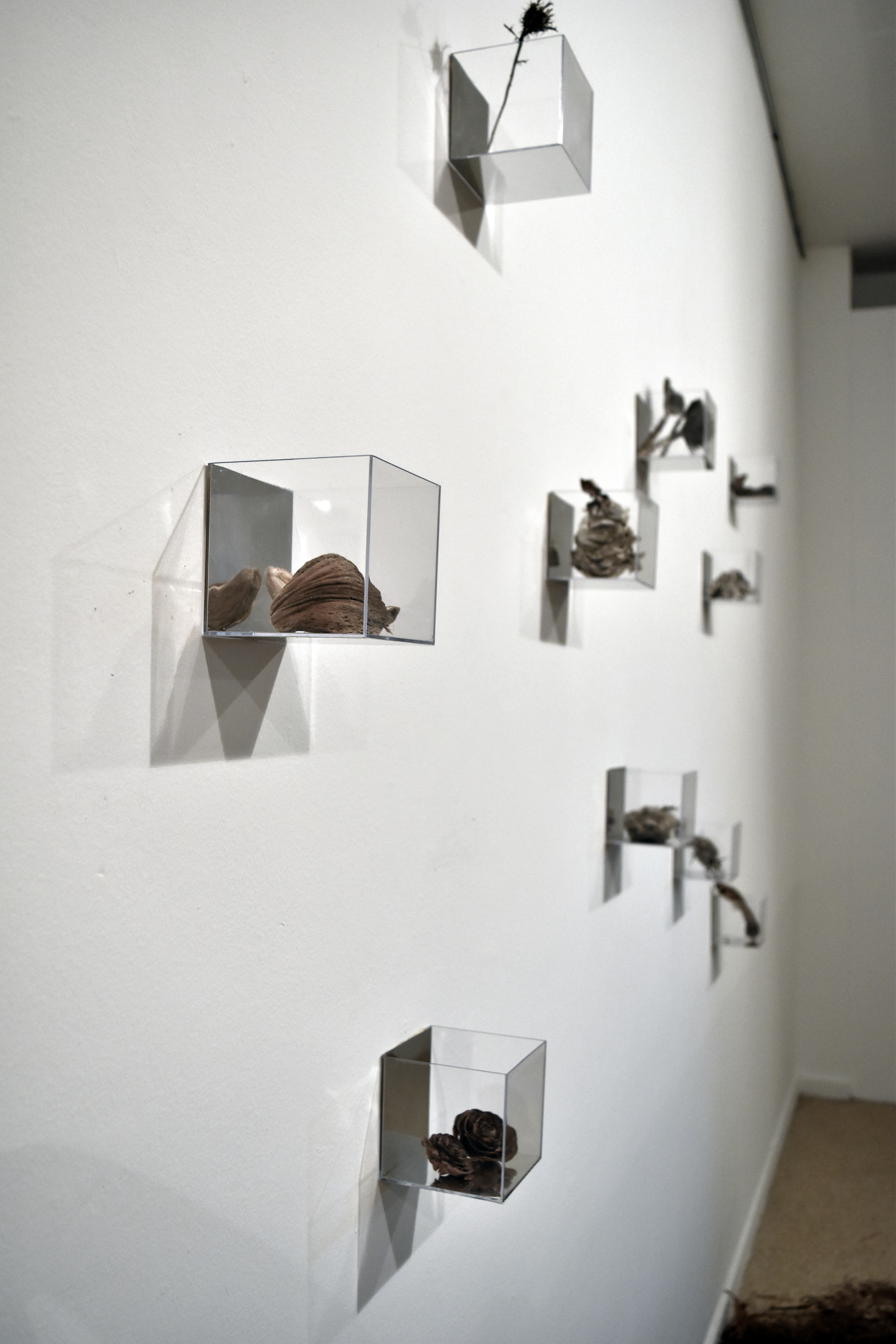 Instalación de 10 cubos contenedores de metacrilato transparente de 9x9x9 cm. cada uno, espejo de vinilo, elementos naturales recolectados y lecho de pinocha seca recolectada. Dimensiones variables. Obra realizada para exposición individual titulada Realidades Ocultas en el Centre Cultural “Peris Aragó” en Alboraya.