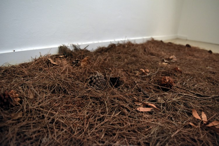 Al exponer diversos objetos orgánicos encontrados y recogidos mientras camino, los resignifico mediante esos pequeños contenedores de ‘tesoros’, disparando así mi memoria; es una obra intimista. Son estos unos contenedores de objetos y de recuerdos, los cuales generan unos juegos de volúmenes debido a los reflejos de la luz y de las sombras que proyectan. Existe aquí una dialéctica entre lo geométrico y lo orgánico, que a su vez dialoga con lo esparcido en el suelo. A nivel del suelo hay un lecho de pinocha para ser transitado y compartir con el espectador una experiencia sensorial y auditiva, al tanto que olfativa, haciéndole partícipe así de parte de mi experiencia.